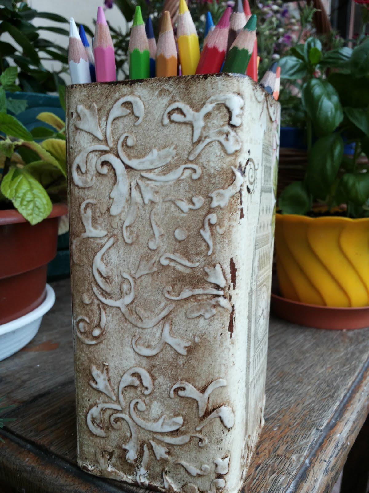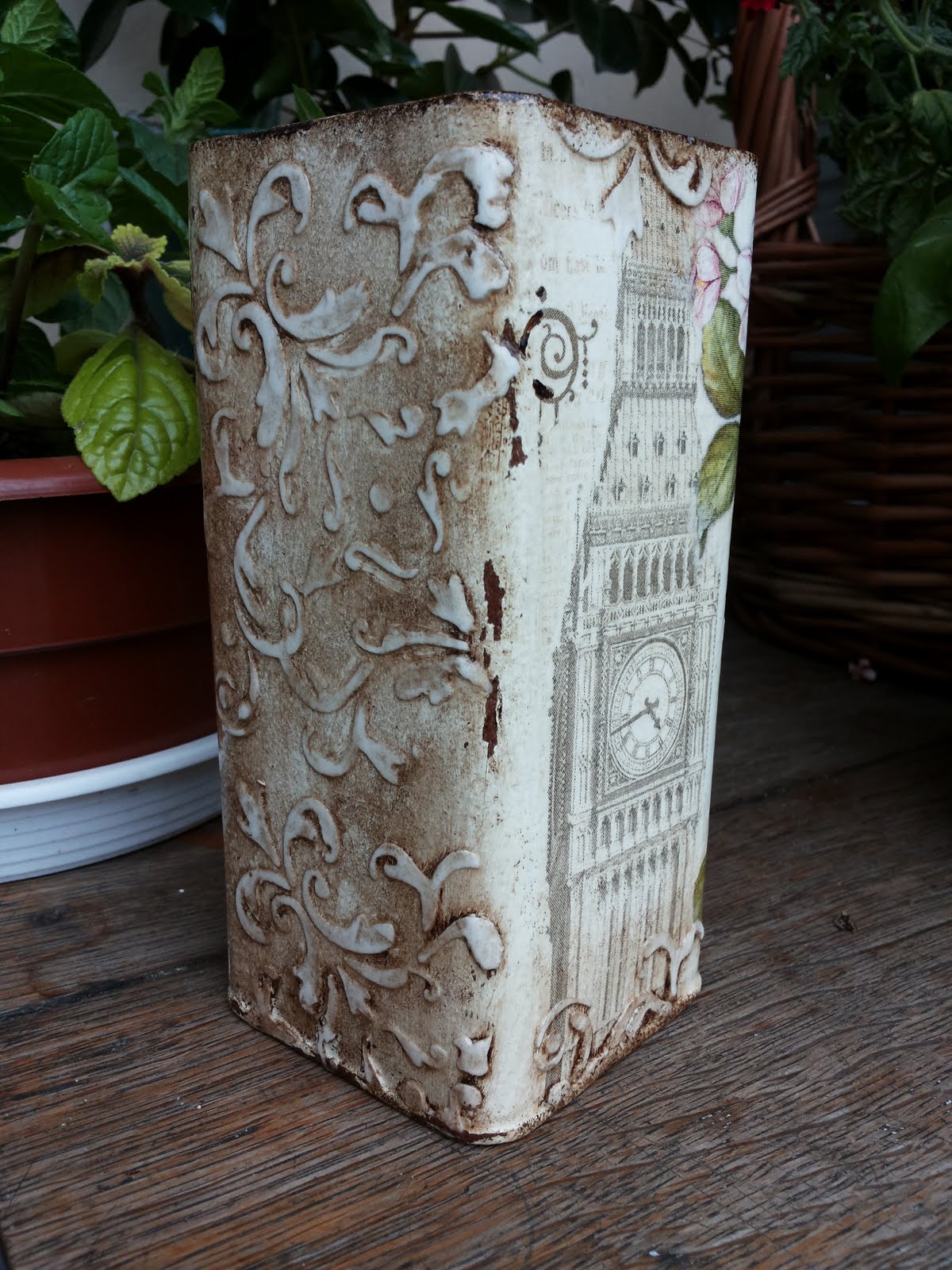 Bardzo fajnie to zrobiłaś, podoba mi się wszystko: i reliefy, i zegar, i jabłonka i sam kształt pojemnika, który chociaż prosty, wygląda teraz świetnie! Kupiłam sobie twoja patynkę i jestem bardzo zadowolona :)