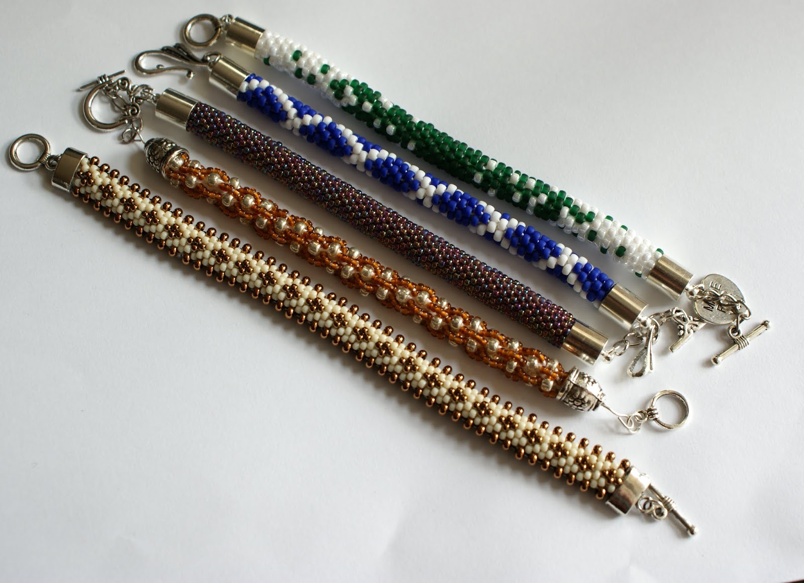To już chyba nałóg :) Kilka zrobionych, kilka nieskończonych. Proste sznury szydełkowo- koralikowe. Muszę koniecznie nauczyć się ukośników. Kto wie gdzie szukać dobrego kursiku?