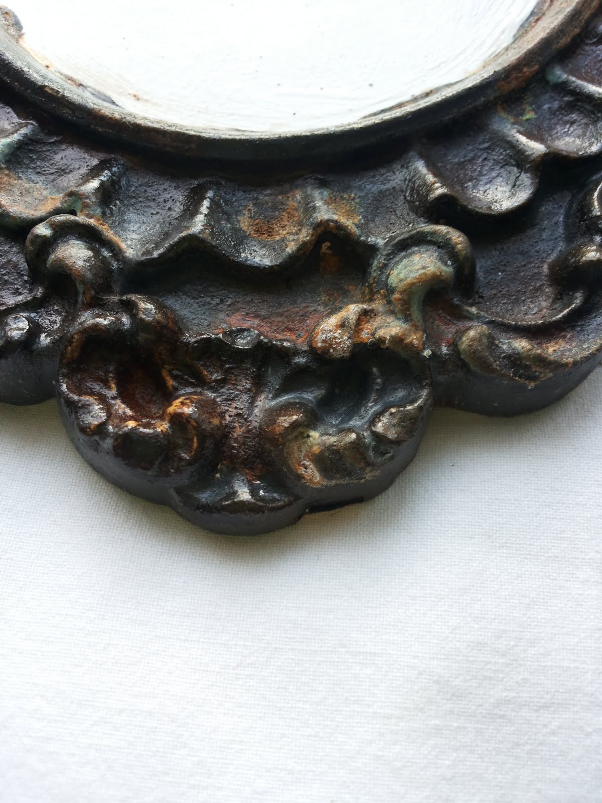 Ramka to gipsowy odlew. Postanowiłam go troszkę postarzyć, pordzewić. Nie ukrywam, że miałam ochotę wypróbować sole patynujące - nowy nabytek. Wyszło ciemne tło z plamami rdzy. Tak jak chciałam. Ale zmienił się pomysł na zastosowanie ramki. Nie będzie to ramka na zdjęcie tylko na lusterko. Czekam na nie. Wybaczcie więc brzydki środeczek. Nie mogłam się już doczekać i wkleiłam takie fotki.