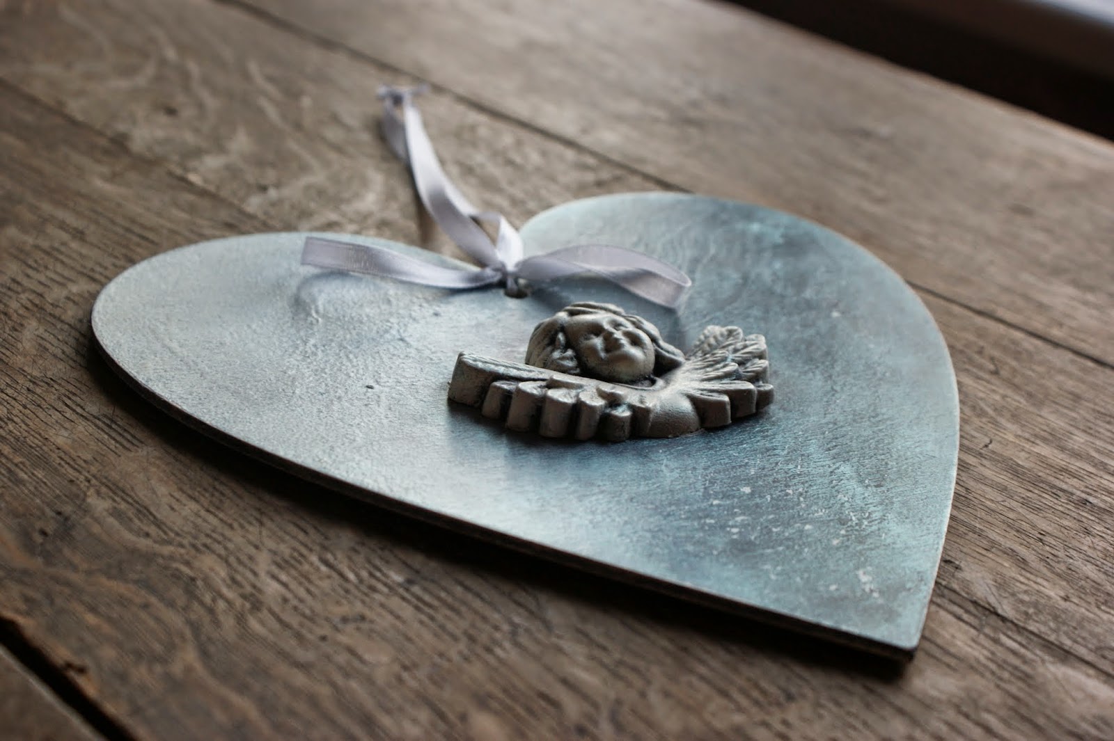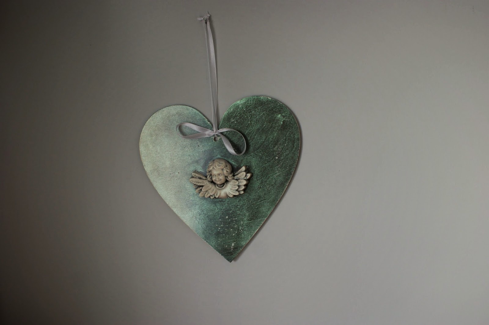 Serducho z aniołkiem. Mieni się jak kameleon, a to za przyczyną wosków z Pentartu. Aniołek gipsowy, popatynowany i przyklejony do serducha.