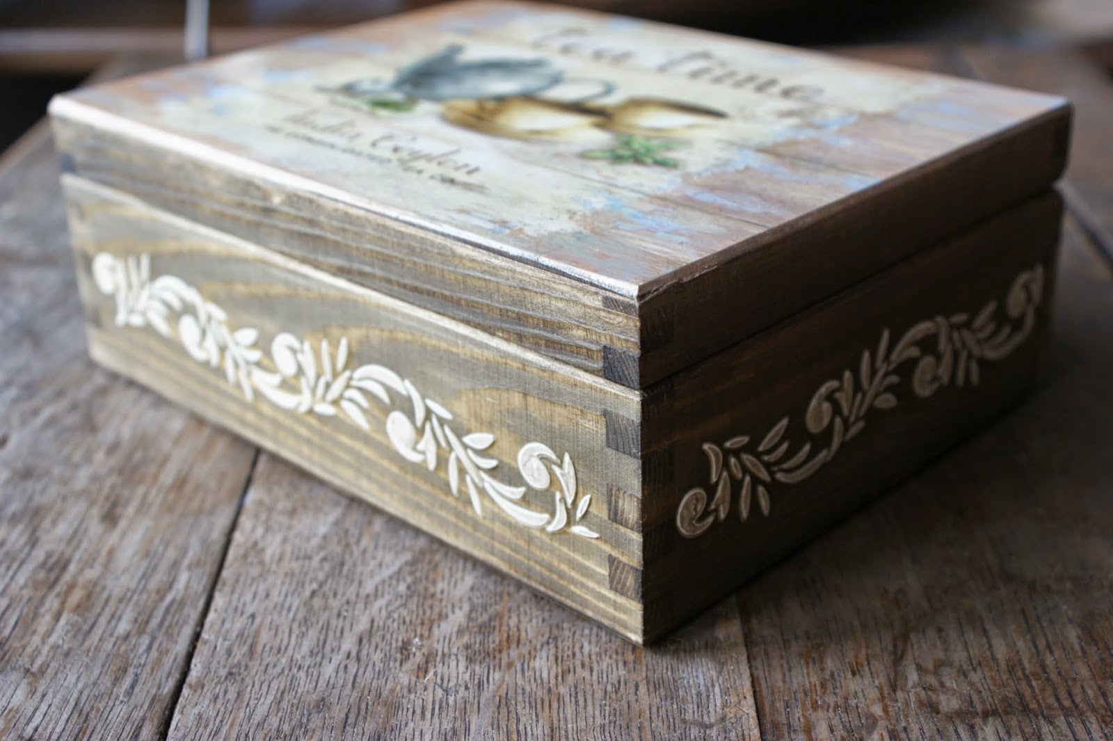Herbaciarka z fajnym motywem, który był troszkę za mały, musiałam go częściowo domalować. Dół- szablonik na bejcowanym drewienku.