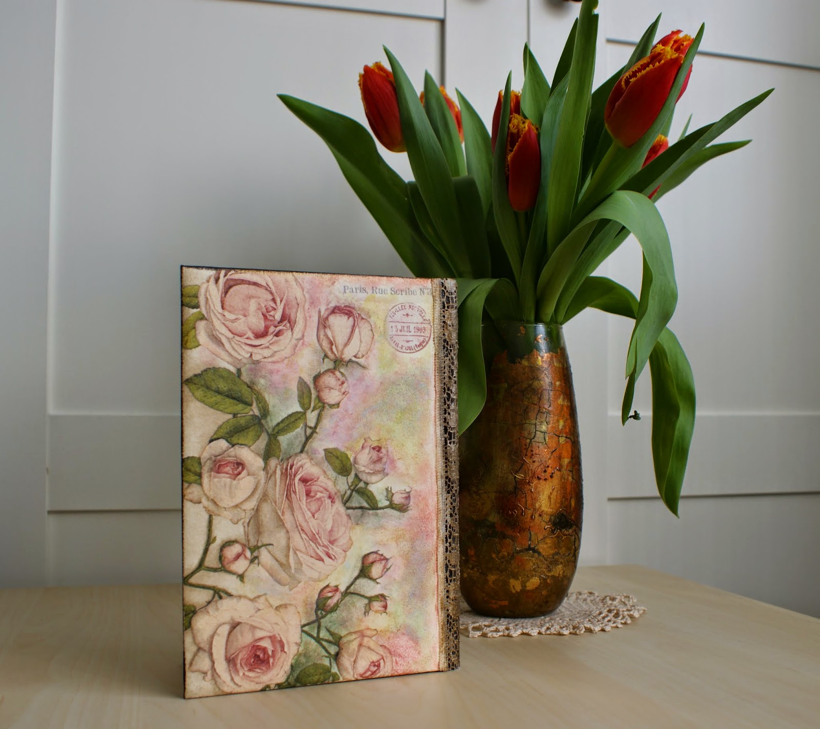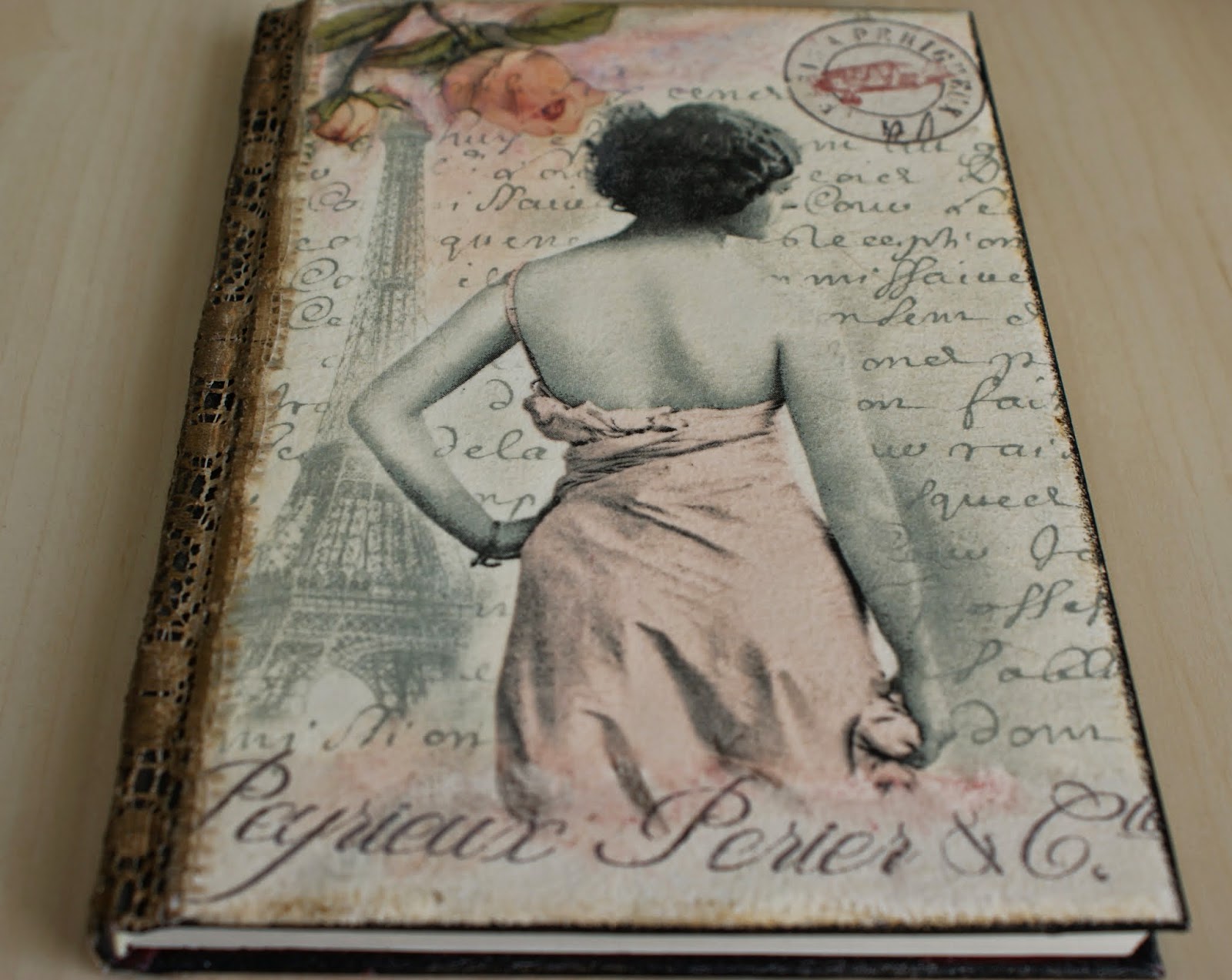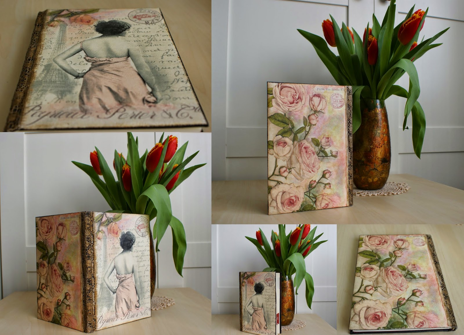 Na Forum Decoupage został ogłoszony konkurs, pt. Być kobietą. Fajny, taki babski temat, dużo możliwości. Mimo pernamentnego braku czasu postanowiłam wziąć udział.Tym bardziej, że miałam już zaczęty kalendarz- przygotowany do ozdobienia. Zmieniłam tylko zamysł i zrobiłam go w babskich klimatach. Grzbiet ozdobiłam koronką, popatynowałam, powoskowałam trochę. Całość wylakierowana aksamitnym w dotyku matowym lakierem. I oto jest!