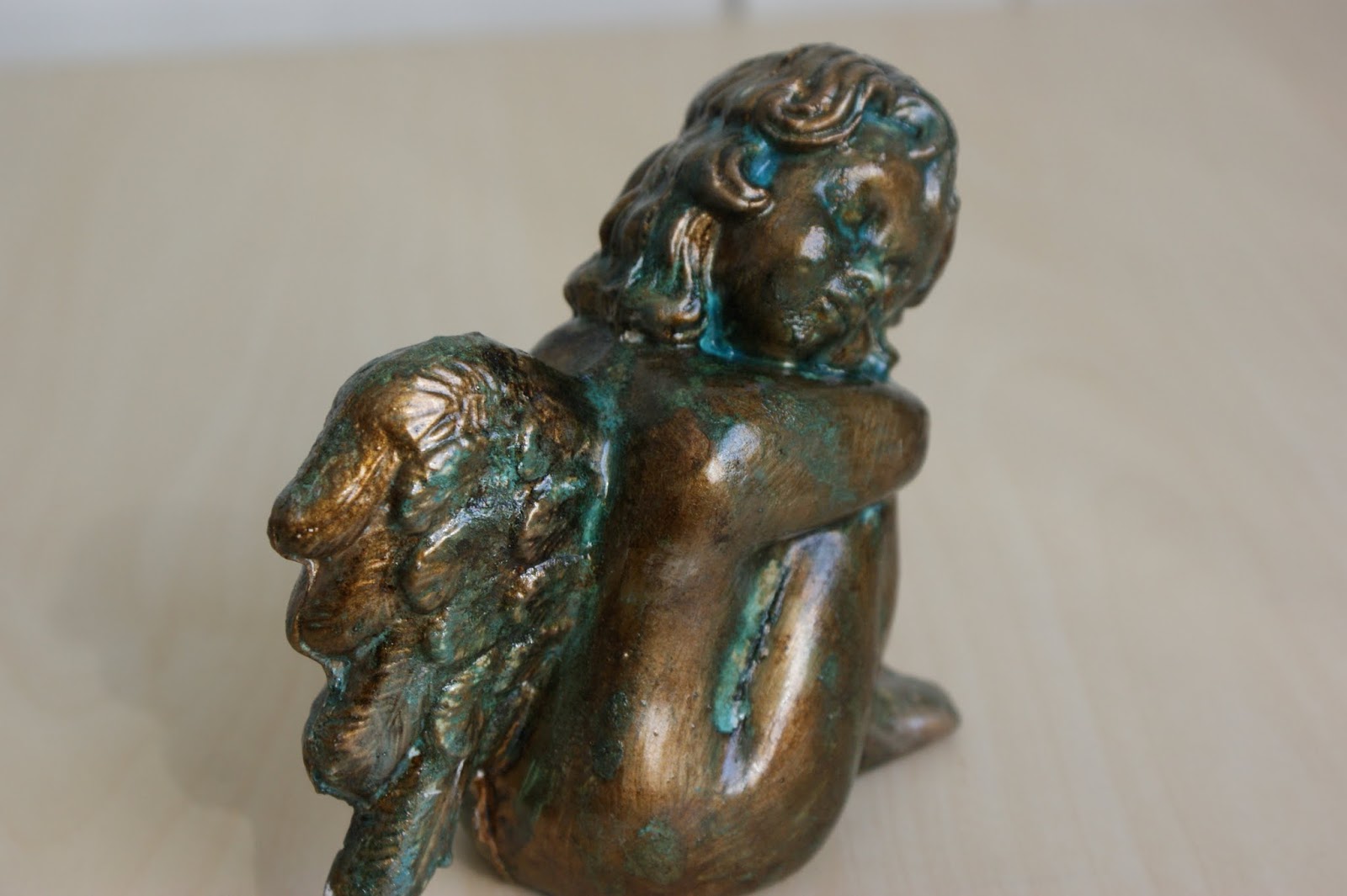 i na koniec aniołek- inwalida. Dostałam go na zlocie od Olinty, ale w podróży stracił palce u stóp. Bo on gipsowy jest :) Troszkę go postarzyłam, posoliłam popatynowałam i wyszedł taki stareńki, zniszczony...